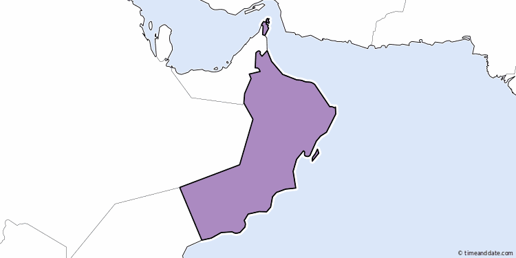 7:25:21 am Friday, December 5, 2025Fullscreen Country: OmanLong Name: Sultanate of OmanAbbreviations: OM, OMNCapital: MuscatTime Zones: 1Dial Code: +968 Time Zone in Oman 7:25 amSalalahGSTUTC +4 7:25 amNizwaGSTUTC +4 7:25 amSeebGSTUTC +4 7:25 amMuscatGSTUTC +4 See all Time Zones in OmanSee Holidays in OmanCreate a Calendar for OmanCurrent Local Time in Locations in Oman with Links for More Information (4 Locations)MuscatFri 7:25 amSalalahFri 7:25 amNizwaFri 7:25 amSeebFri 7:25 amPopup WindowFullscreenExitOman7:2521amFriday, December 5, 2025Need some help?Tools & ConvertersMeeting Planner for MuscatTime Zone Converter for MuscatEvent Time Announcer for MuscatTime difference between Muscat and other locationsDistance calculator to/from MuscatDisplay a free clock for Muscat on your website or blogCalendar & HolidaysCreate Oman calendarUpcoming HolidaysDec 21 - December SolsticeJan 1 - New YearJan 16 - Isra and Mi'rajMore Holidays in OmanAirportsMuscat International Airport, MCTSalalah Airport, SLLKhasab Airport, KHSMasirah Air Base, MSHThumrait Air Base, TTHSOHAR, OHS